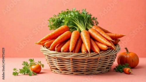 Fresh organic carrots in a wicker basket are a healthy and colorful addition to any vegetarian diet on a pink background