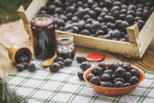 Fresh organic plums in wooden plate with jar of jam in background. Plums products. Plums on table. Plum background