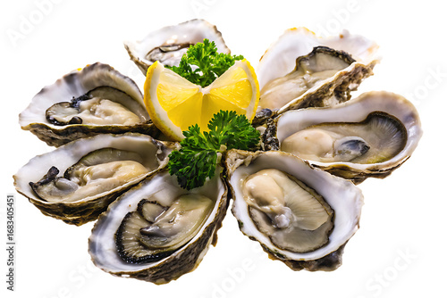 Fresh Oysters Arranged in Circle with Lemon and Parsley isolated on a transparent background