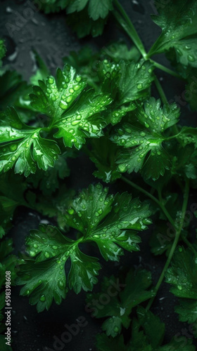 Fresh parsley with water drops, close-up shot on black background. Generative AI.