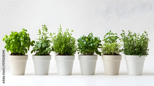 Fresh potted herbs, like basil or thyme, or a vibrant green plant in a white flowerpot, isolated for a natural garden feel