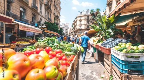 produce, market, street, stall, seller, shopper, fruit, vegetable, tomatoes, apple, green, red, yellow, orange, broccoli, crate, blue, wooden, racked, sidewalk, building, city, urban, sunny, day, people, crowd, tied-up, vibrant, fresh, healthy, food, agriculture, local, commerce, shopping, aisle, paseo
