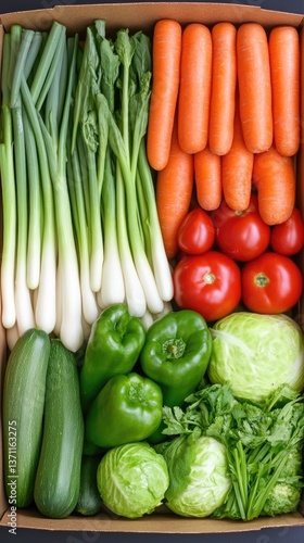 Fresh produce assortment arranged neatly in a cardboard box. Vibrant colors and diverse textures