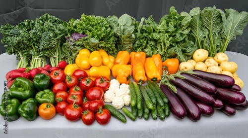 Fresh produce display at a vibrant farmer s market, showcasing colorful fruits and vegetables against a neutral backdrop
