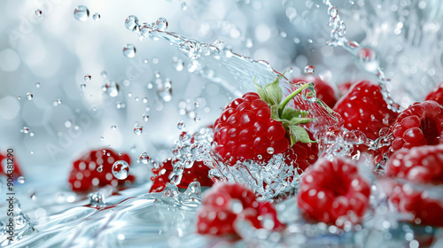 Fresh raspberries submerged in clear water, captured mid-splash, creating a refreshing and vibrant scene that showcases the juicy and delicious nature of the fruit.