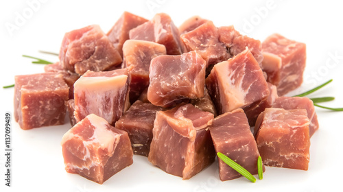 Fresh Raw Beef Cubes with Herbs and Spices on White Background