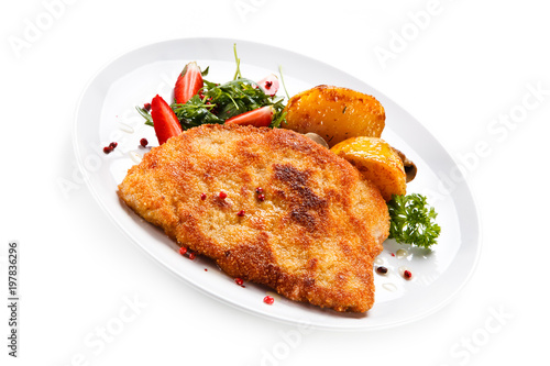 pork meat, chop, steak, beef, grilled, steak, schnitzel, fried, beefsteak, meat, food, roast, dinner, sirloin, chips, baked, meal, vegetable, salad, bar-b-q, roasted, plate, chop, grill, tomatoes, tomatoes, potato, rocket, potato, lettuce, cooked, dining, vegetable, horizontal, eatery, portion, background, poultry, white