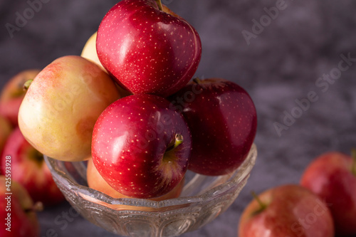 Fresh red and green apples in a glass vase close-up.