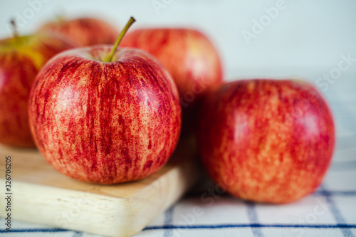 Fresh red apples on wooden cutting board and towel background.