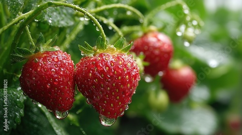 Fresh red strawberries with water droplets and green calyx, selective focus on foreground berry, blurred natural background, healthy snack