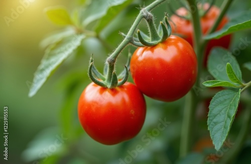Fresh red tomatoes growing on a vine in a lush green garden, illuminated by natural sunlight