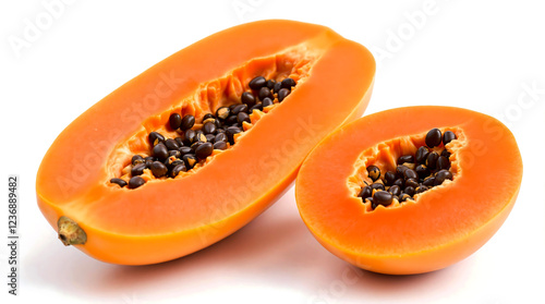 Fresh Ripe Papaya Fruit Cut in Half with Black Seeds on White Background