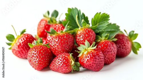 Fresh, ripe strawberries with vibrant red color and green leaves on a white background.