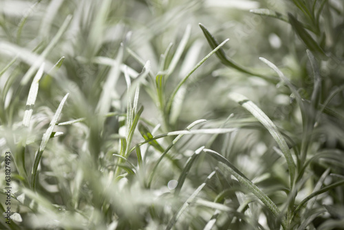 Fresh Rosemary Herb grow outdoor. Rosemary leaves Close-up.
