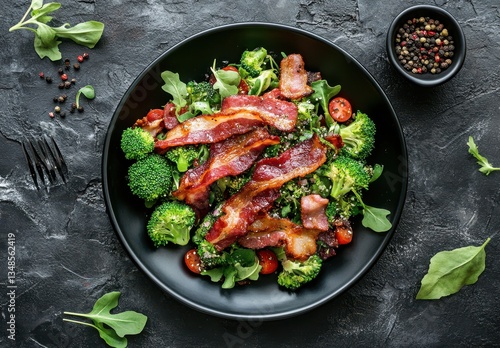 Fresh Salad with Crispy Bacon, Cherry Tomatoes, Broccoli, and Arugula Served in a Modern Black Plate on a Dark Rustic Background with Peppercorns