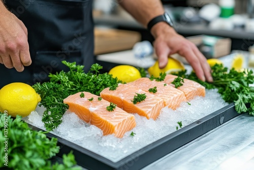 salmon, seafood, culinary, chef, kitchen, preparation, ice, fresh, garnishing, lemon, parsley, cooking, eatery, display, food, ingredient, bright, light, epicure, healthy, meal, nourishment, professional, skill, surface, counter, hand, sharpened, cookery, herb, fish, slicing, plating, utensil, freshness, arrangement, presentation, kitchen utensile, styling, culinary arts