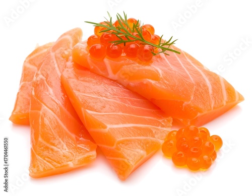 salmon, slice, red, caviar, dill, fresh, fish, food, healthy, delicious, orange, protein, nourishment, seafood, epicure, cookery, tasty, pale, isolated, white, background, closeup, top, view, ingredient, dish, premium, deliciously