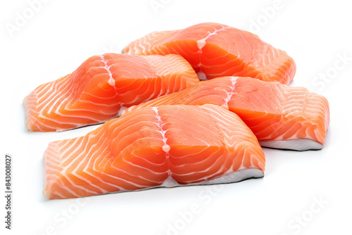 Fresh salmon steak isolated on the white background. Salmon Red Fish Steak. Large Pile of trout steak. Big organic steaks of salmon lined up. Big pieces raw salmon.
