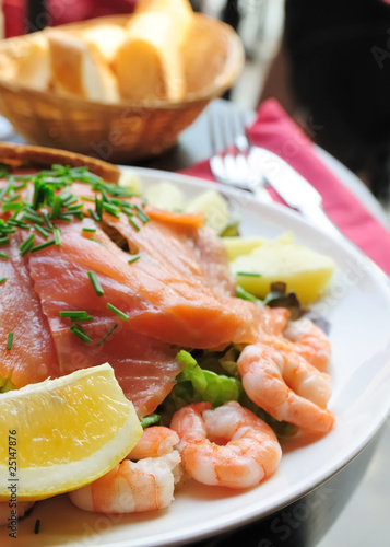 food, salmon, epicure, salad, healthy eating, smoked salmon, plate, meal, prepared fish, meat, lettuce, fruit, freshness, dish, fresh, green, leaf, red, vinegar, culinary, diet, fish, protein, eatery, seafood, shrimp, snack, starter, vegetable, lemon, bread, carrot, cream, sauce