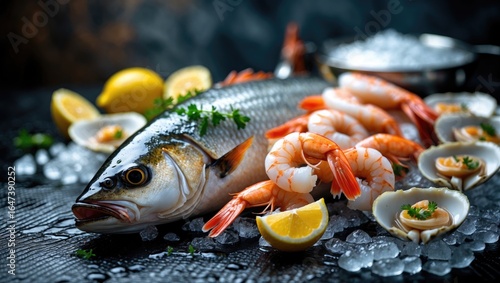 Fresh seafood platter featuring fish, shrimp, lemon wedges, and oysters on ice, ready for cooking or serving.