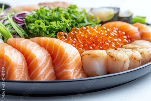 Fresh seafood platter featuring salmon fillets, prawns, and roe, garnished with greens and vegetables, perfect for sushi lovers and seafood enthusiasts