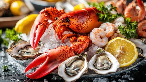 Fresh seafood platter with lobster, shrimp, and oysters on ice.