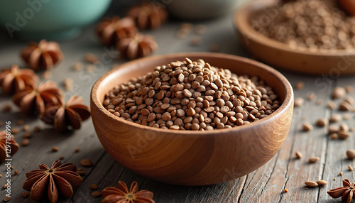 Fresh seeds in a wooden bowl, earthy mood, displayed on a rustic table background