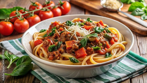 Fresh spinach pasta swirled with homemade tomato sauce and tender ground beef, served in a crisp white bowl, awaiting a satisfying forkful.