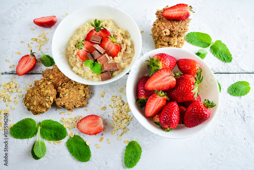 strawberry, strawberry, ripe, oatmeal, grain, oat, breakfast, juicy, fresh, vitamin, mint, leaf, cookie, snack, bowl, summer, chocolate