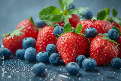 fresh, strawberry, blueberry, falling, gracefully, beautiful, cyan, background, fruit, colourful, ripe, juicy, health, nourishment, tasty, vibrant, organic, natural, delicious, summer, overflowing, abundance, refreshing, exquisite, high-coloured, composition, diet, food, freshness, juice, splashing, aromatic, bursting, harvest, tumbling