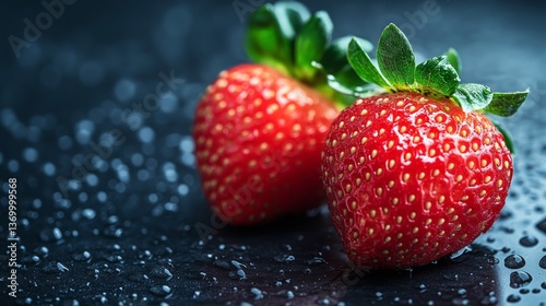 Fresh strawberries glisten with droplets of water on dark surface after washing in kitchen
