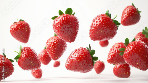 Fresh strawberries in mid-air, creating a vibrant splash of color against a bright background during a sunny day