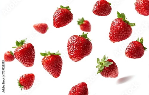 strawberry, red, fresh, fruit, food, summer, healthy, vibrant, juicy, ripe, delicious, organic, nature, vitamin, sweet, blood-red, berry, falling, flying, isolated, white, background, closeup, macro, food photography, produce, scattered, pile, plentiful, red fruit, top, leaf, green, stem, vitamin c, healthy eating, alimentary, natural, picked, seasonal, quality, foodstuff