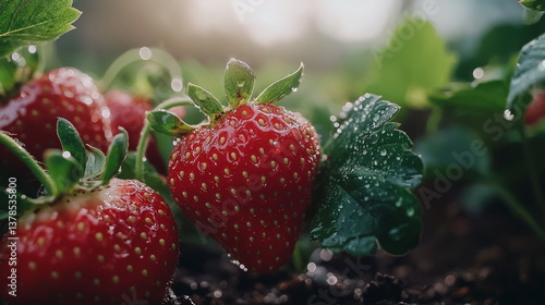 strawberry, fresh, dew, garden, green, nature, closeup, summer, sunlight, vibrant, agriculture, fruit, healthy, organic, outdoors, ripe, juicy, harvest, spring, watering, growth, natural, food, seasonal, gardening, freshness, delicious, red, fertility, sweetness, vitamin, alimentary, abundant, wellness, tasty, pecking, bright, lush, botanical, favor, cultivation, sunlit, fruity, backyard, earth