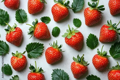 Fresh strawberries with vibrant green leaves arranged neatly on a light background