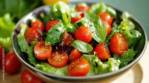 Fresh Summer Salad: A Close-Up of Small Bowl Filled with Lettuce, Cherry Tomatoes, and Basil