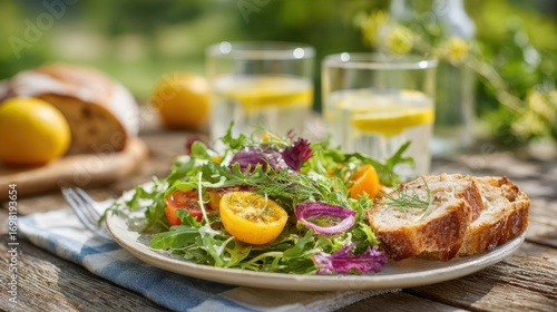 Fresh Summer Salad With Bread And Lemon Water On Rustic Table. Healthy Outdoor Dining Experience
