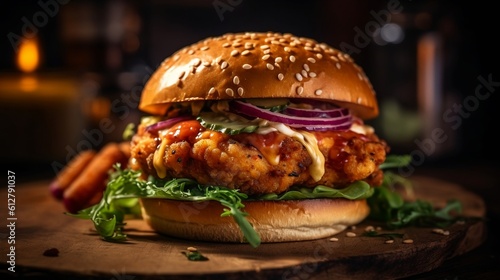 generative, ai, fresh, tasty, chicken, burger, wood, table, delicious, juicy, flavorful, grilled, savoury, bun, lettuce, tomatoes, cheese, condiment, meal, fast food, homemade, hunger, appetising, mouth-watering, satisfaction, indulgence, comfort, poultry, sandwich, mealtime, lunch, dinner, natural, rustic, presentation, food photography, cookery, bite, favor, combination, ingredient, culinary, aroma, tempting, deliciously