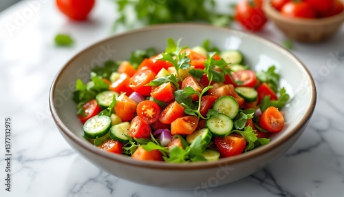 Fresh Tomato Cucumber Salad in Bowl with Parsley and Onion