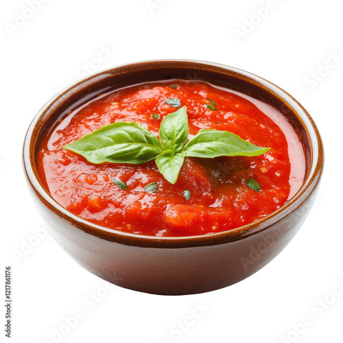Fresh tomato sauce garnished with basil leaves in a brown bowl on a transparent background, Tomato sauce in a bowl isolated on transparent background