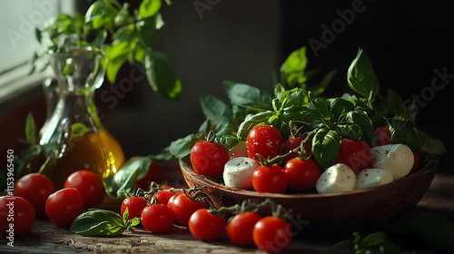 Fresh tomatoes and basil arranged in a wooden bowl with olive oil on a rustic table during the afternoon light