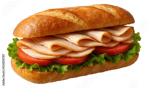 Fresh turkey sandwich with sliced turkey breast, tomato, and lettuce in a crusty baguette.
