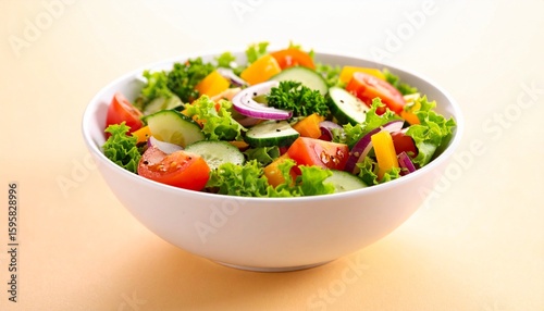 Fresh vegetable salad with lettuce, cherry tomatoes, cucumber, red onion, and cheese in white bowl on white background