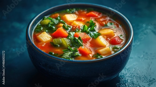 Fresh vegetable soup in a dark bowl with chopped carrots potatoes tomatoes celery and herbs served on a vibrant blue textured background