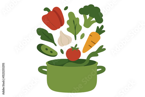 Fresh vegetables are depicted falling into the pot in a vector layered paper cut style illustration, symbolizing cooking food and healthy meals made from natural organic ingredients for menu posters