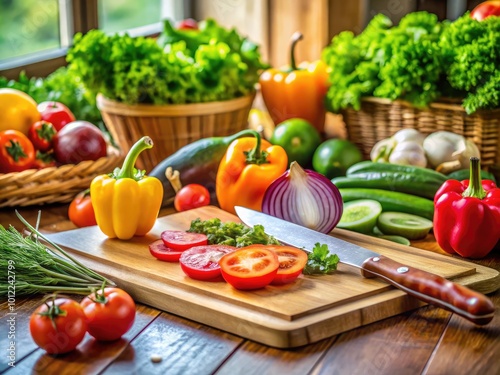 Fresh Vegetables Being Sliced on a Wooden Cutting Board with a Sharp Knife in a Kitchen Setting