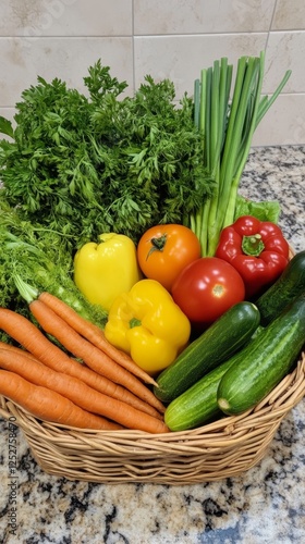 fresh, vegetable, basket, kitchen, counter, carrot, tomatoes, cucumber, green, onion, yellow, pepper, bell, parsley, organic, healthy, nourishment, cooking, preparation, ingredient, grocery, colourful, local, produce, crunchy, arrangement, nature, farm, seasonal, wellness, vegetarian, diet