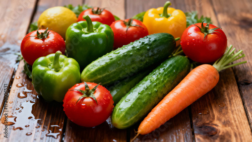 cucumber, tomatoes, carrot, bell pepper, lemon, green pepper, yellow pepper, red tomato, water droplets, wooden table, fresh vegetable, produce, health food, vegetable, crop, natural food, raw food, herb, fresh produce