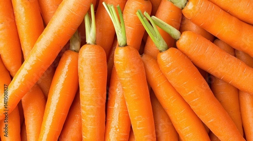 Fresh Vibrant Carrots Gathered Together on a Natural Surface in Bright Orange Color with Green Tops