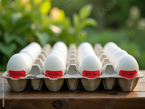 Fresh white eggs in a carton labeled "selling" on a wooden surface with a blurred green background. Farm fresh and ready for purchase.